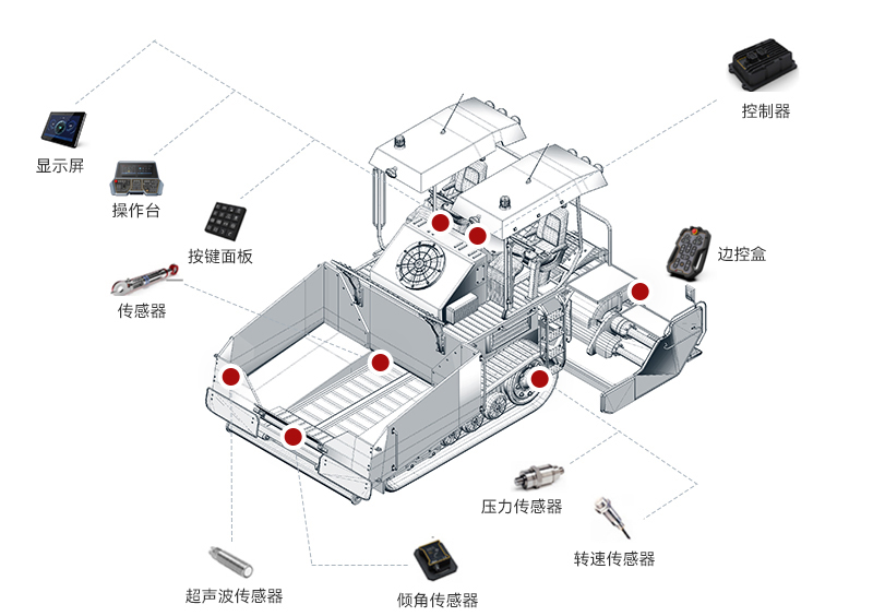 zoty中欧智能摊铺机解决方案整合了感知技术、自动控制系统和数据分析算法,实现了摊铺机高度智能化操作。通过实时获取路面信息和实时调整施工参数,使摊铺机操作更加精准、高效和可靠。